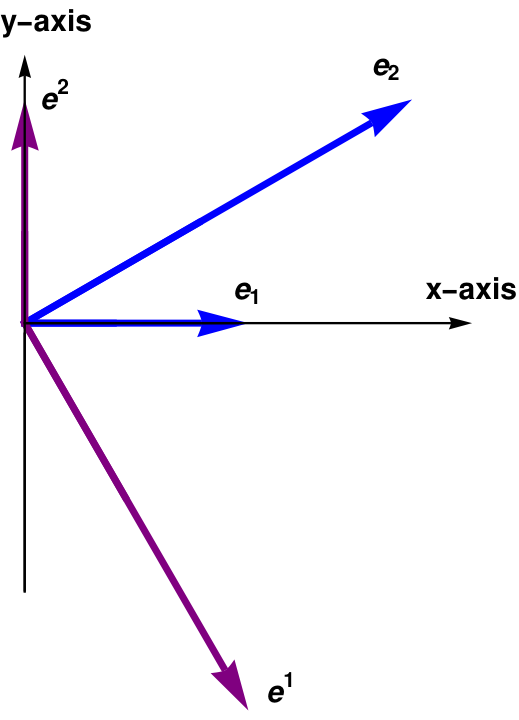 The set of basis vectors (in blue) and their corresponding covectors (in purple) for the example in Figure 5.1 are