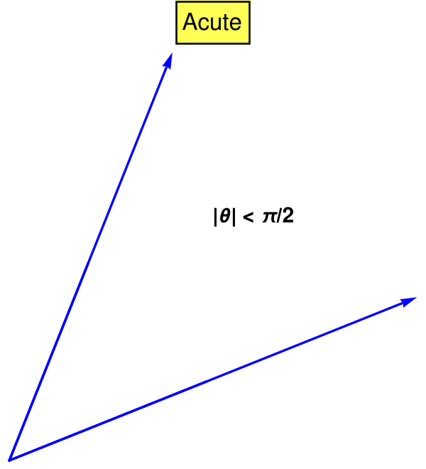 Cosine is positive for acute angle (−π/2 < θ < π/2) and negative for obtuse angle, π/2 < θ < 3π/2. We visualize all these situations with figures below: