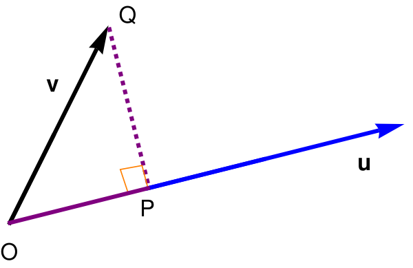 Let θ be the included angle between v and u. From trigonometry, considering the right triangle (O, P, Q), we know that
