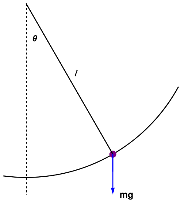 We consider an approximation that lead to derivation of so called simple pendulum model. Let denote by θ(t) the inclination of the rod to the vertical at time t. If s(t) denoted the distance the bob has moved from the vertical in a counterclockwise direction, then θℓ = s. Equating m(d²s/dt²) to the force component that is tangential to the path of the bob has moved, we obtain the following equation of motion: \[ m\ell\,\ddot{\theta} = -mg\,\sin\theta , \] where g is the acceleration due to gravity. The tension along the spring/rod does not enter because it acts normally to the path of the bob.