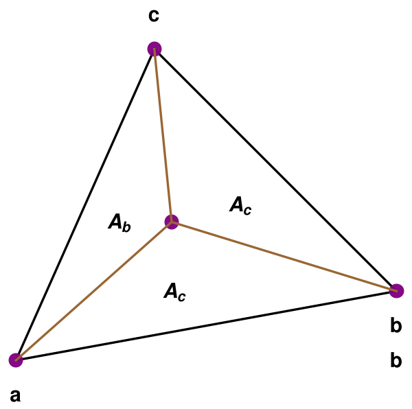 Barycentric coordinates allow us to express the coordinates of p = (x, y) in terms of 𝑎, b, c. More specifically, the barycentric coordinates of p are the numbers β and γ such that \[ p = a + \beta\left( b-a \right) + \gamma \left( c -a \right) \] If we regroup 𝑎, b, c, we obtain \begin{align*} p &= a + \beta\,b - \beta\,a + \gamma\,c - \gamma\,a \\ &= \left( 1 - \beta - \gamma \right) a + \beta\,b + \gamma\,c . \end{align*} It is customary to define a third variable α by \[ \alpha = 1 - \beta - \gamma . \] Then we have \[ p = \alpha\,a + \beta\, b + \gamma\,c , \qquad \alpha + \beta + \gamma = 1 . \] The barycentric coordinates of the point p in terms of the points 𝑎, b, c are the numbers α, β, γ such that p = α𝑎 + βb + γc, with α + β + γ = 1.