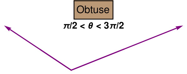 Cosine is positive for acute angle (−π/2 < θ < π/2) and negative for obtuse angle, π/2 < θ < 3π/2. We visualize all these situations with figures below:
