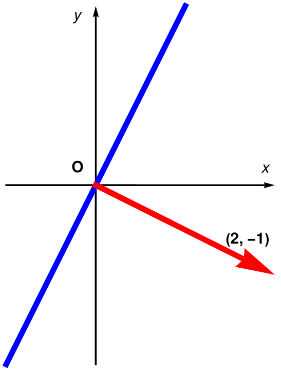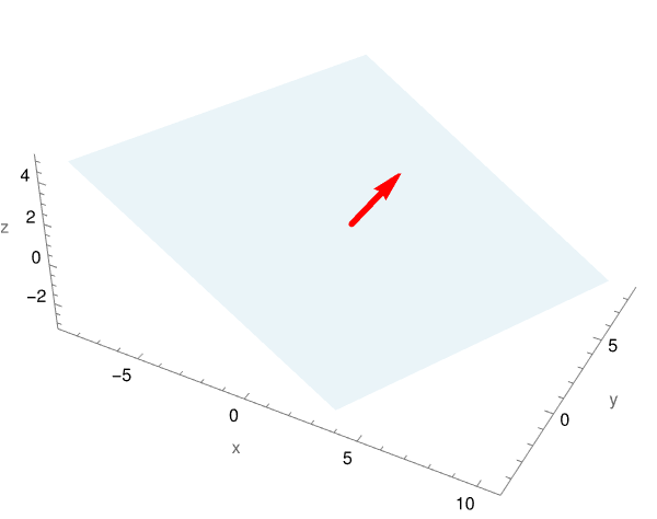 This section uses the dot product to find equations of a plane in 3D and then in a general case. The key is to write points in the plane as all those at right-angles to a certain direction. This direction is perpendicular to the required plane, and is called a normal. Let’s start with an example of the idea in 2D.Recall that orthogonal vectors have their dot product equals to zero. Thus, the position vector x of every point in the line satisfies the dot product x • (2, −1) = 0. For x = (x, y), we get 2x −y = 0, so the equation of the line is 2x −y = 0.