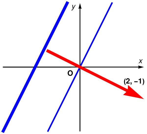 Another problem: Now we consider a similar problem but asking to find the equation of the line that passes through the point (0, 0.7) instead of the origin. Then it has the displacement vector x − (0, 0.7) that must be orthogonal to (2, −1), as illustrated in the figure below. That is, the equation of the line is (x, y − 0.7) • (2, −1) = 0. Evaluating the dot product gives 0.7 + 2x − y = 0.