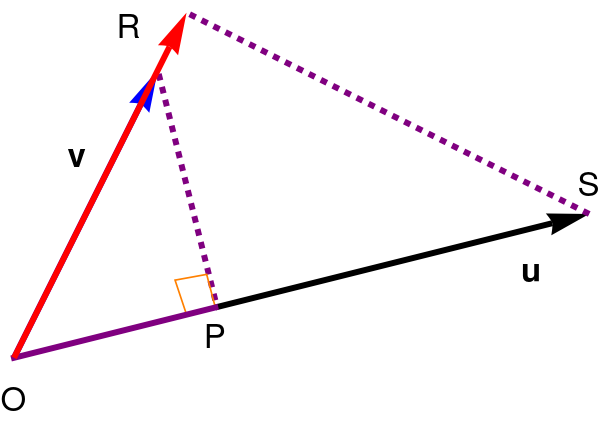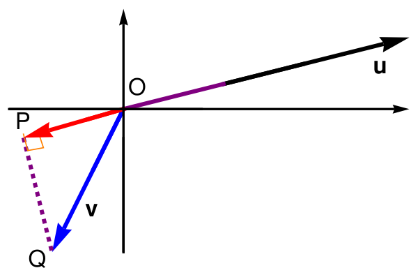 Let θ be the included angle between v and u. From trigonometry, considering the right triangle (O, P, Q), we know that